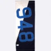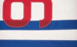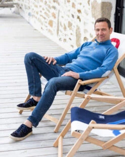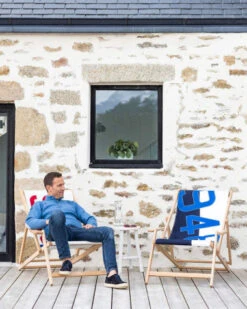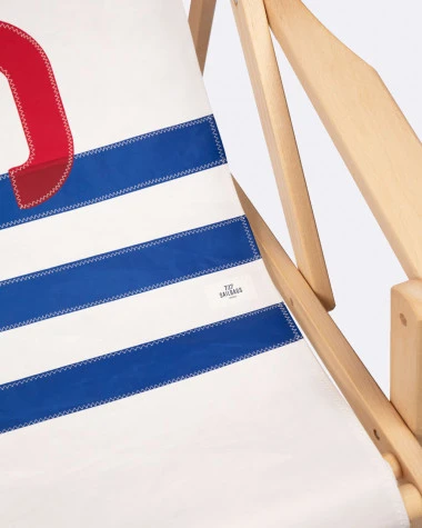 This deckchair features durable recycled sailcloth decorated with blue stripes and a large number “956” in red.