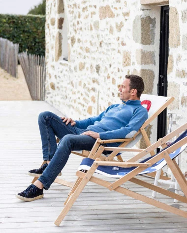 Sturdy and comfortable, the chair frame with armrests is made from beechwood. Adjustable in 3 positions, with stainless steel notches. The sailcloth is removable, if needed.