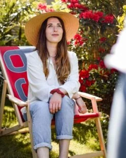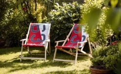 This deckchair features white recycled sailcloth, red fabric and the number “635” in grey, applied with our signature zig zag stitch.