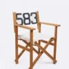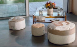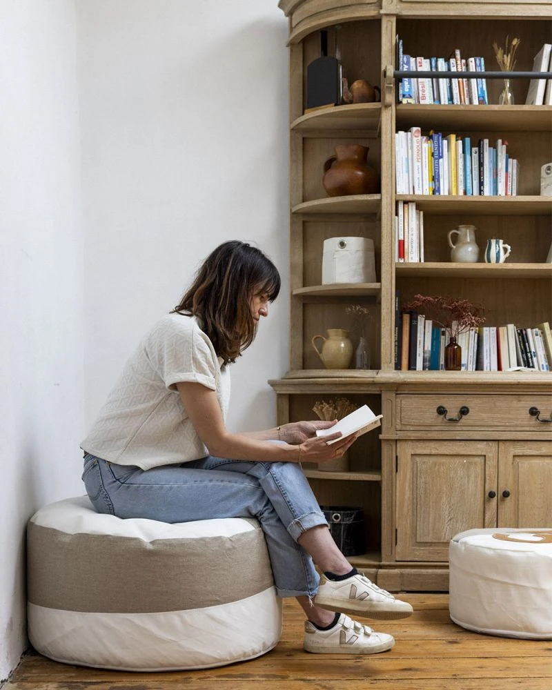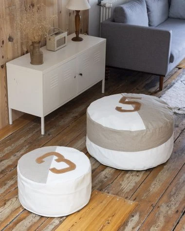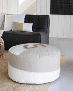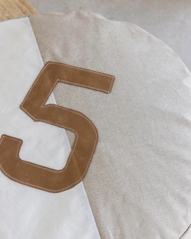 Solo Bean Bag made from recycled sailcloth, with natural linen and leather number.