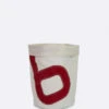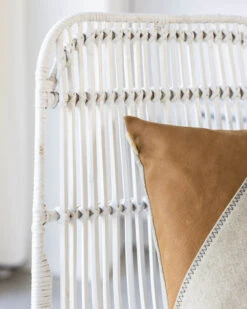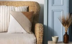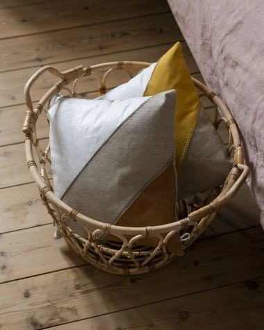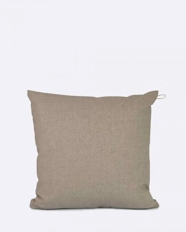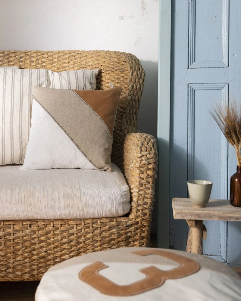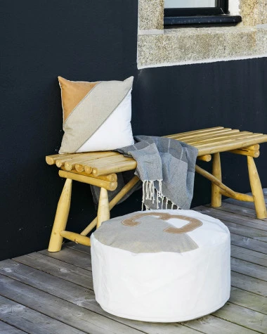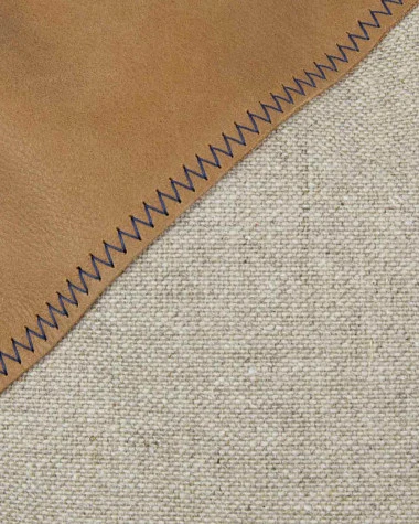 It features a blend of linen, brown leather and recycled sail. The cover is removable and great for both outdoor and indoor use.