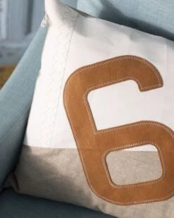It features a blend of linen and recycled sail, with a large “6” in brown leather, sewn with our iconic zigzag stitch. The cover is removable and great for both outdoor and indoor use.