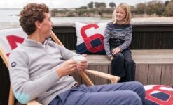 Made from 100% recycled sail, this stylish cushion features a navy blue acrylic fabric with a “6”red number applied on it with our signature zig zag stitch. The cover is removable and is great for both outdoor and indoor use.