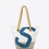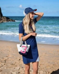 This everyday handbag features a navy blue fabric base and a pink “3” sewn with our iconic zigzag stitch.