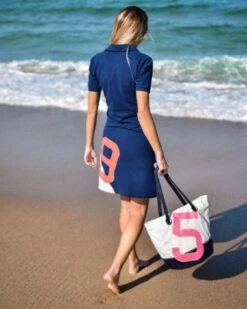 Made from 100% recycled sail, the Sandy handbag from SummerTime collection oozes authenticity and will seduce you with its perfect cut and high-quality confection. It is made of a navy fabric base, white recycled sailcloth and a large pink “5”, sewn with our iconic zigzag stitch.