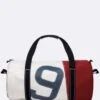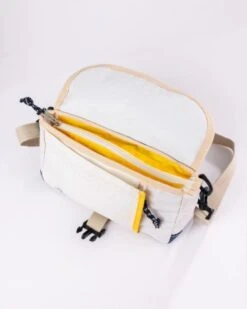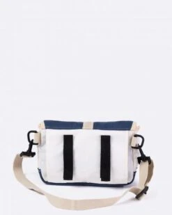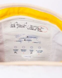 The Scooty handlebar cross-body bag is made from recycled Dacron cruising sail and thick waterproof 100% cotton blue canvas. The yellow spinnaker sail details add a colorful touch, for a sporty and modern look.