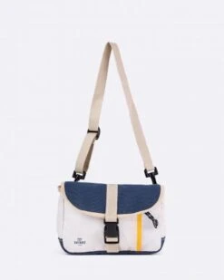 The Scooty handlebar cross-body bag is made from recycled Dacron cruising sail and thick waterproof 100% cotton blue canvas. The yellow spinnaker sail details add a colorful touch, for a sporty and modern look.