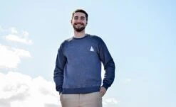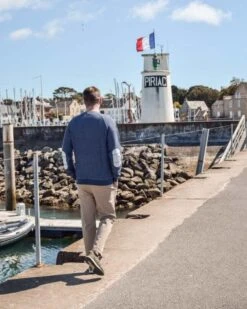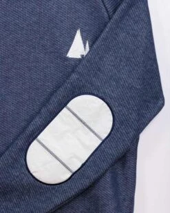 In heather blue and heather gray colourways, it pairs perfectly with jeans, chinos or shorts. For a more elegant look, wear it over a crisp white shirt or polo shirt, with the collar sticking out. For a more casual look, wear it over a t-shirt. The added bonus: its elbow patches and its sail motif (embroidered over the heart) comes in flexible and light recycled spinnaker sail.