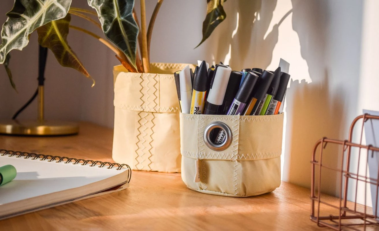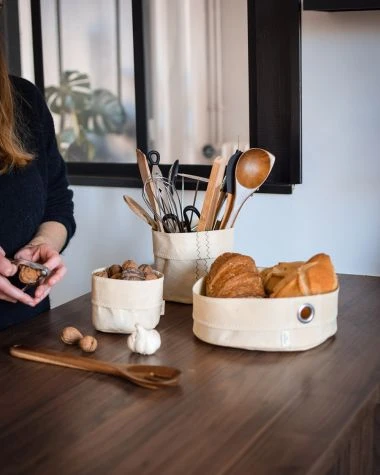 Our beige table baskets are made of 100% recycled sailcloth. These baskets are sold individually and come in different sizes.