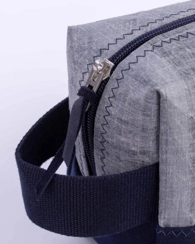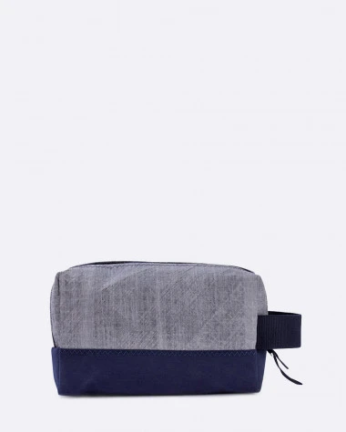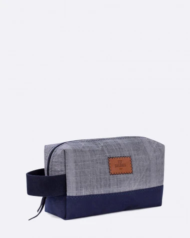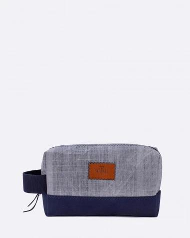 This stylish and sustainable toiletry case is crafted from recycled grey technical sail and features a durable fabric navy blue base.