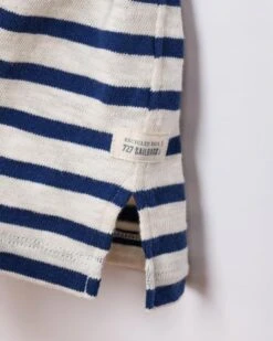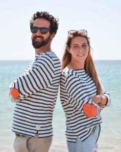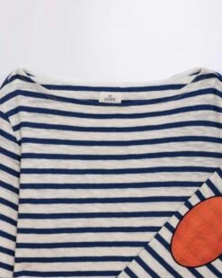 With seasonal shades, 727 Sailbags striped sailor tops feature elbow patches made using 100% recycled spinnaker sail.