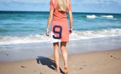 Made from 100% stretch piqué cotton, this comfortable and breezy dress features unique details such as wooden buttons and a bold, zigzag stitched number at the hem, evoking a classic nautical charm.
